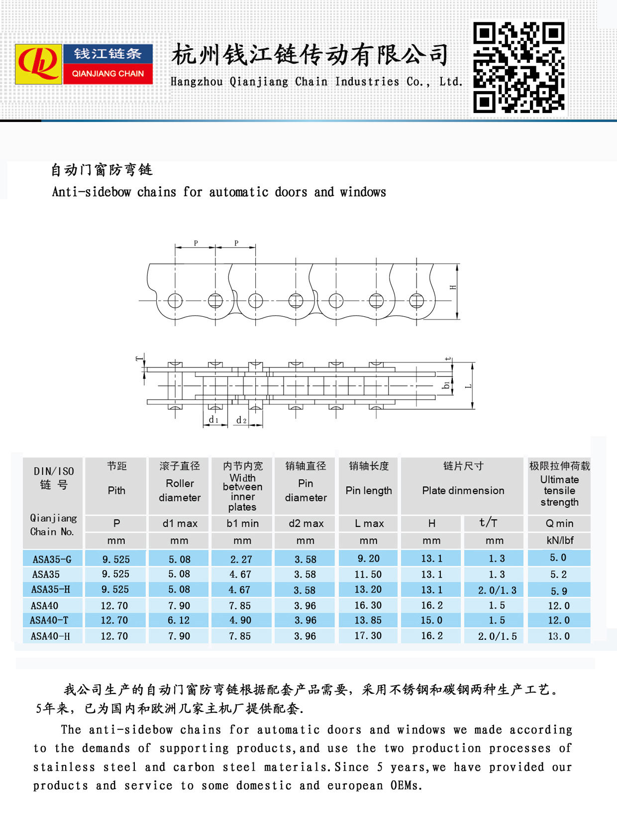 Precizní zpracování Odolné proti stárnutí Antiboční řetězy pro automatické dveře a okna – řešení pro hladký a spolehlivý provoz automatických dveří a oken. Tyto řetězy, které jsou precizně navrženy a vyrobeny tak, aby vydržely, jsou vyrobeny z pokročilých materiálů, které zajišťují mimořádnou životnost a odolnost proti opotřebení, a to i v drsném prostředí. Ať už se jedná o teploty, vlhkost nebo neustálé používání, naše řetězy proti postrannímu oblouku si zachovávají svůj tvar a pevnost, čímž eliminují nežádoucí boční pohyby (boční oblouk) pro bezproblémový výkon.