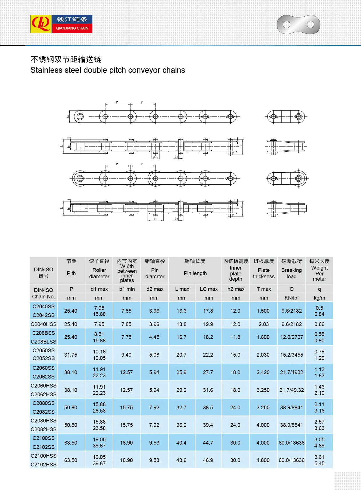 Nerezové dopravníkové řetězy s dvojitou roztečí, navržené s ohledem na pevnost a dlouhou životnost, jsou vyrobeny z vysoce kvalitní nerezové oceli, díky čemuž jsou odolné vůči korozi, opotřebení a povětrnostním podmínkám. Jejich robustní konstrukce zajišťuje spolehlivý výkon i při velkém zatížení, výrazně snižuje náklady na údržbu a prostoje.